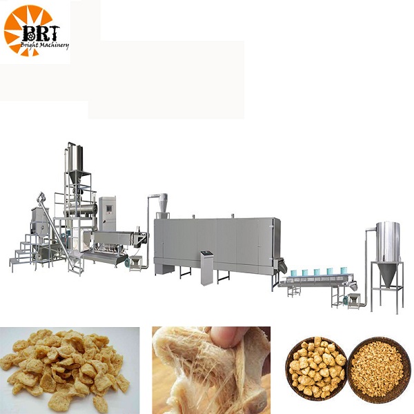 สายการผลิตอาหารโปรตีนถั่วเหลืองใช้กากถั่วเหลืองอุณหภูมิต่ําโปรตีนถั่วเหลืองแยกผงกลูเตน ฯลฯ เป็นวัตถุดิบหลัก กระบวนการต่าง ๆ เช่นการหลอม, การปรุงอาหาร, การฆ่าเชื้อที่อุณหภูมิสูง, การอัดขึ้นรูป ฯลฯ สร้างโครงสร้างเส้นใยที่เหนียวเป็นชั้น ๆ จึงสร้างโครงสร้างเส้นใยกล้ามเนื้อแบบเลเยอร์ความแข็งแรงสูงความเหนียวสูงคล้ายกับเนื้อสัมผัสและรสชาติ ขึ้นอยู่กับแม่พิมพ์และอุปกรณ์เสริมสามารถผลิตรูปทรงต่างๆเช่นกระบอกสูบบล็อกแผ่นแถบเม็ดพุดดิ้งเศษเล็กเศษน้อย ฯลฯ ตามลําดับ มีความแข็งแรงและทนต่อการเคี่ยวที่อุณหภูมิสูงดังนั้น สายการผลิตอาหารโปรตีนถั่วเหลือง จึงสามารถใช้กันอย่างแพร่หลายในผลิตภัณฑ์จากเนื้อสัตว์อาหารจานด่วนอาหารแช่แข็งอย่างรวดเร็วการบรรจุเครื่องปรุงรสบะหมี่กึ่งสําเร็จรูปเป็นต้น นอกจากนี้ยังสามารถทําเป็นอาหารมังสวิรัติเนื้อขนมขบเคี้ยวและอาหารมังสวิรัติที่มีรสชาติแตกต่างกัน สายการผลิตอาหารโปรตีนถั่วเหลือง เป็นชุดที่สมบูรณ์ของสายการผลิตอัตโนมัติเต็มรูปแบบรวมถึงการผสมวัตถุดิบการอัดขึ้นรูปการอบแห้งการระบายความร้อนและอุปกรณ์อื่น ๆ และมีสายการผลิตที่มีผลผลิตและการกําหนดค่าที่แตกต่างกัน